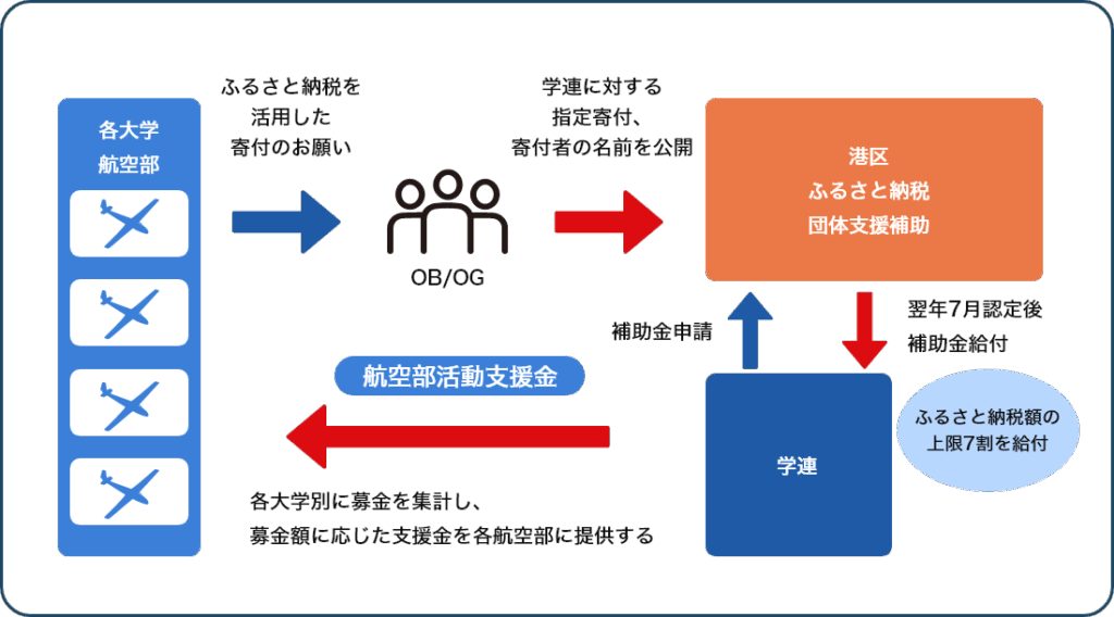 日本学生航空連盟では、全国のOB・OGの皆さまがおトクに母校の航空部を応援できるよう、東京都港区版のふるさと納税制度を採り入れました。