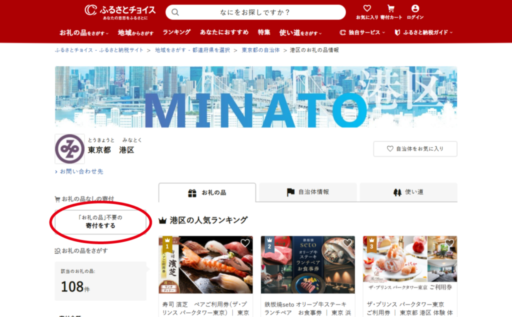 「ふるさとチョイス」の港区のページから申し込むのが簡単です。