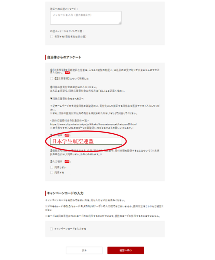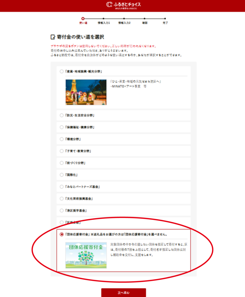 寄付の使い方の選択で、「団体応援寄付金」を選択してください。